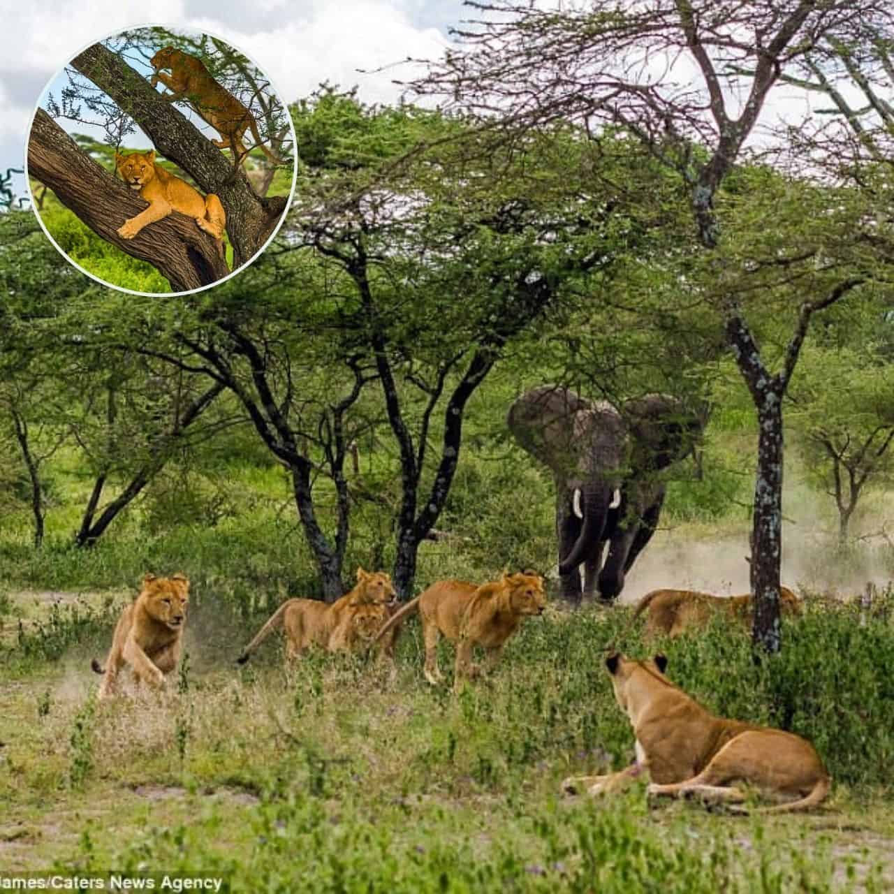 Lions Seek Safety in Trees Amidst Elephant Encounter in Tanzania