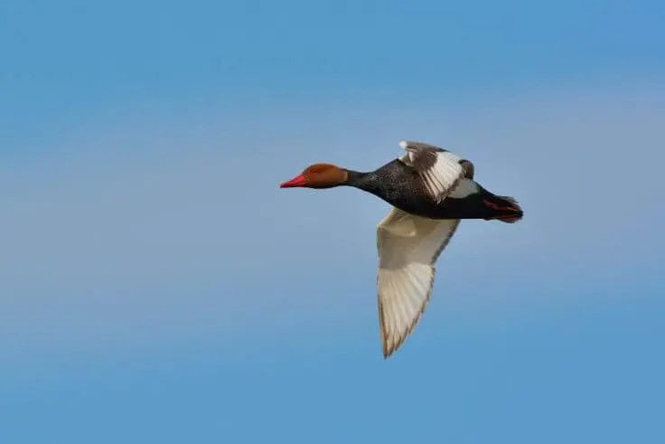 The adult male red-crested pochard is known for its bold look, bright red eyes, a rosy-red bill, and striking black breast and tail. Its rounded head and plump body make its white wing stripes easily visible during flight.