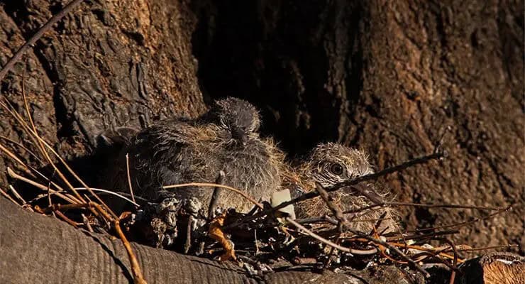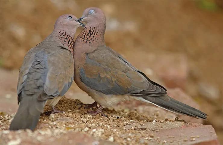 Known for forming lifelong bonds, laughing doves display unique courtship behaviors, including rapid bowing by the male to showcase his collar. Mating rituals involve mutual beak grooming before nest-building in trees or sheltered structures.