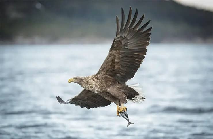These eagles primarily feed on fish, especially pike, and on various bird species. Though capable of catching larger prey, they typically target smaller or vulnerable animals, using trees or cliffs as vantage points for hunting. In regions like Norway, common eiders are a significant part of their diet.